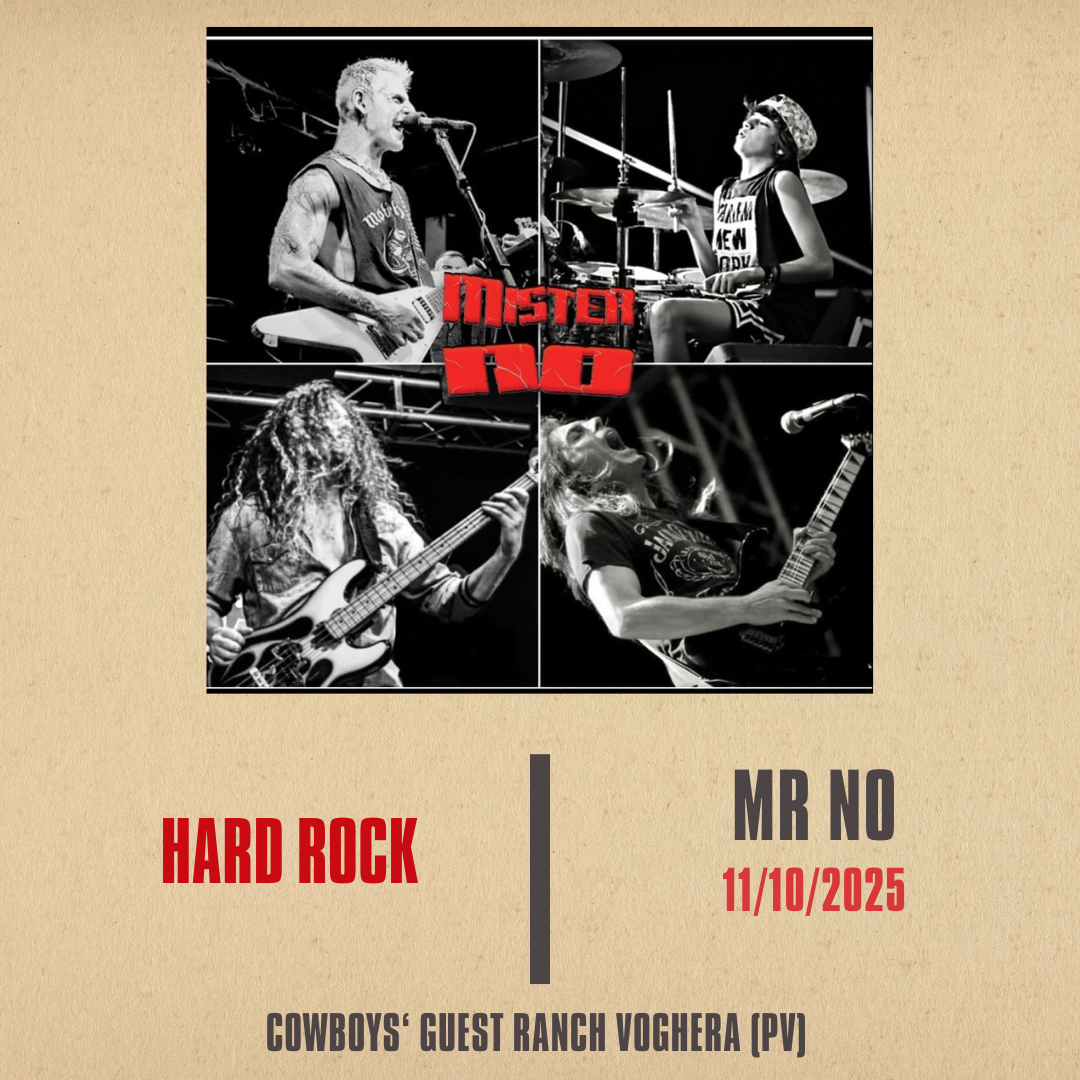 Cowboys' Guest Ranch Via T. Morato 18, Voghera, PV, ItaliaDal 2000 una delle rock band più esplosive del Nord Italia! Hard Rock e Heavy Metal con i classici di AC/DC, Iron Maiden, Kiss, Guns N’ Roses, Metallica e tanti altri 🔥 ⚡ Assoli infuocati, groove spettacolari di basso e batteria, energia pura: ogni concerto dei Mister No è un’esperienza rock indimenticabile!