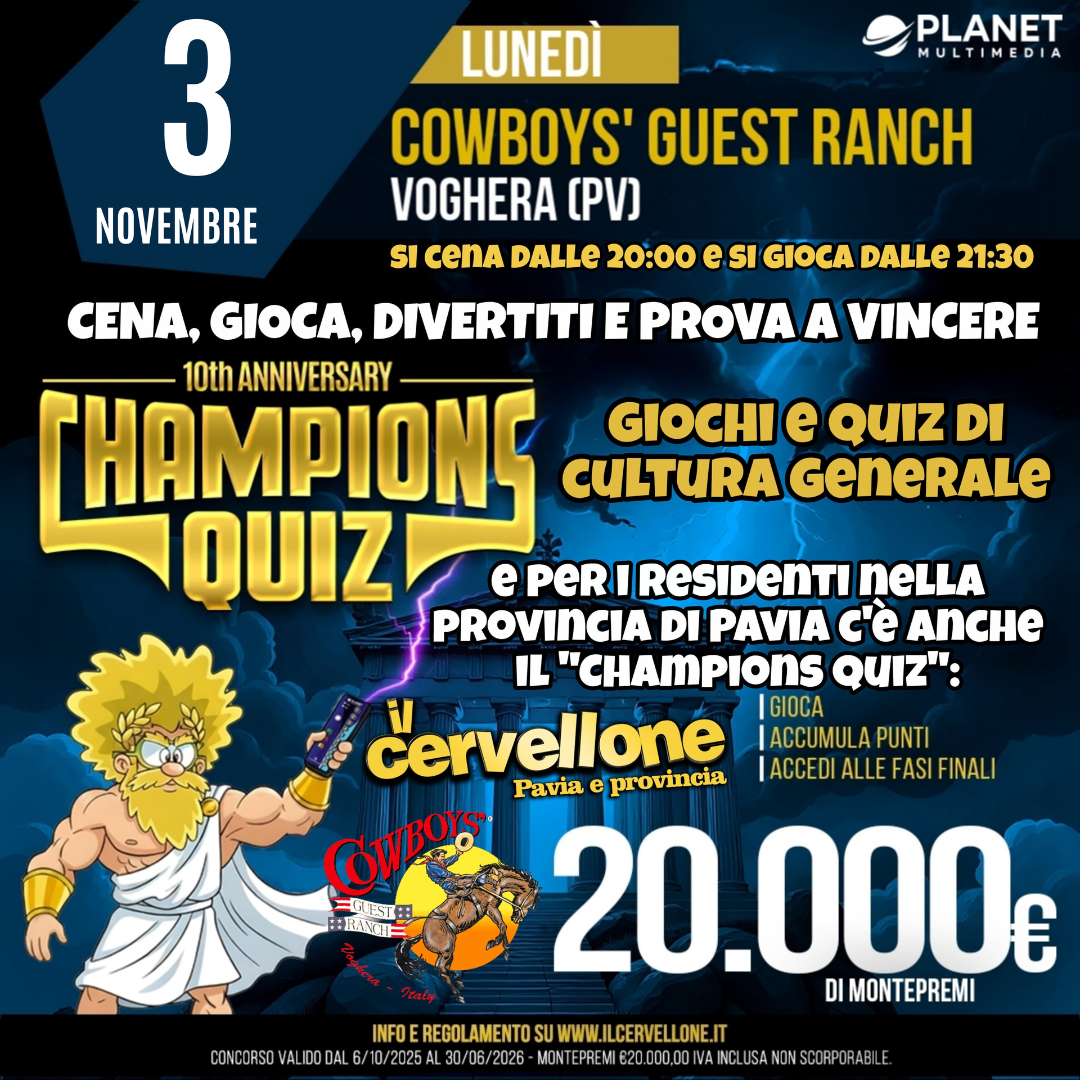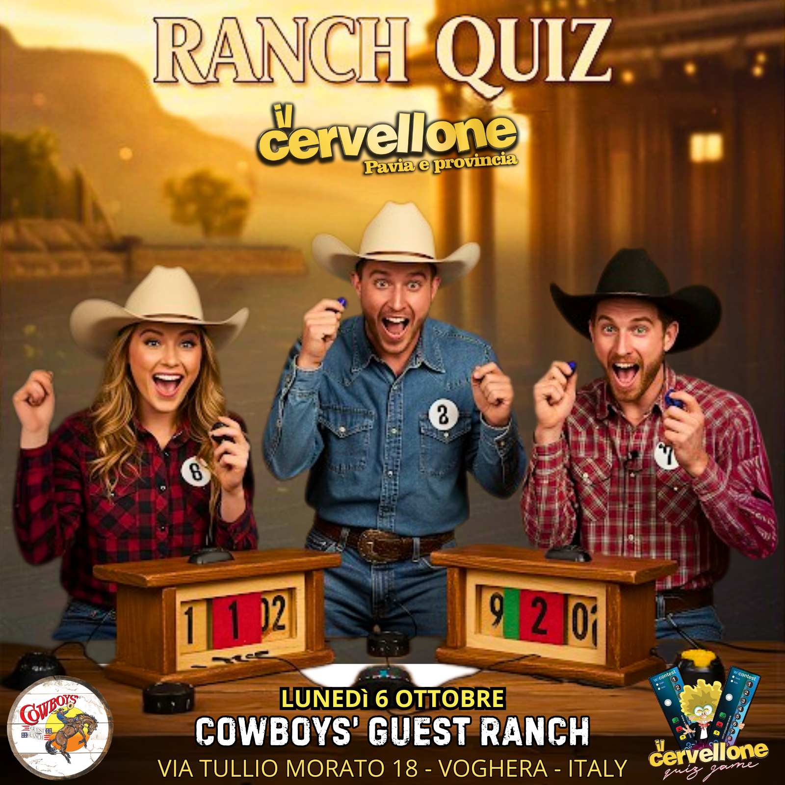 Cowboys' Guest Ranch Via T. Morato 18, Voghera, PV, ItaliaUnisciti al Ranch Quiz Show e sfida i tuoi amici nella competizione più divertente e selvaggia del ranch! Con il mitico Cervellone alla guida, preparati a mettere alla prova le tue conoscenze su cultura generale, curiosità western e tanto altro! Risate, adrenalina e premi ti aspettano. Chi conquisterà la corona del ranch?