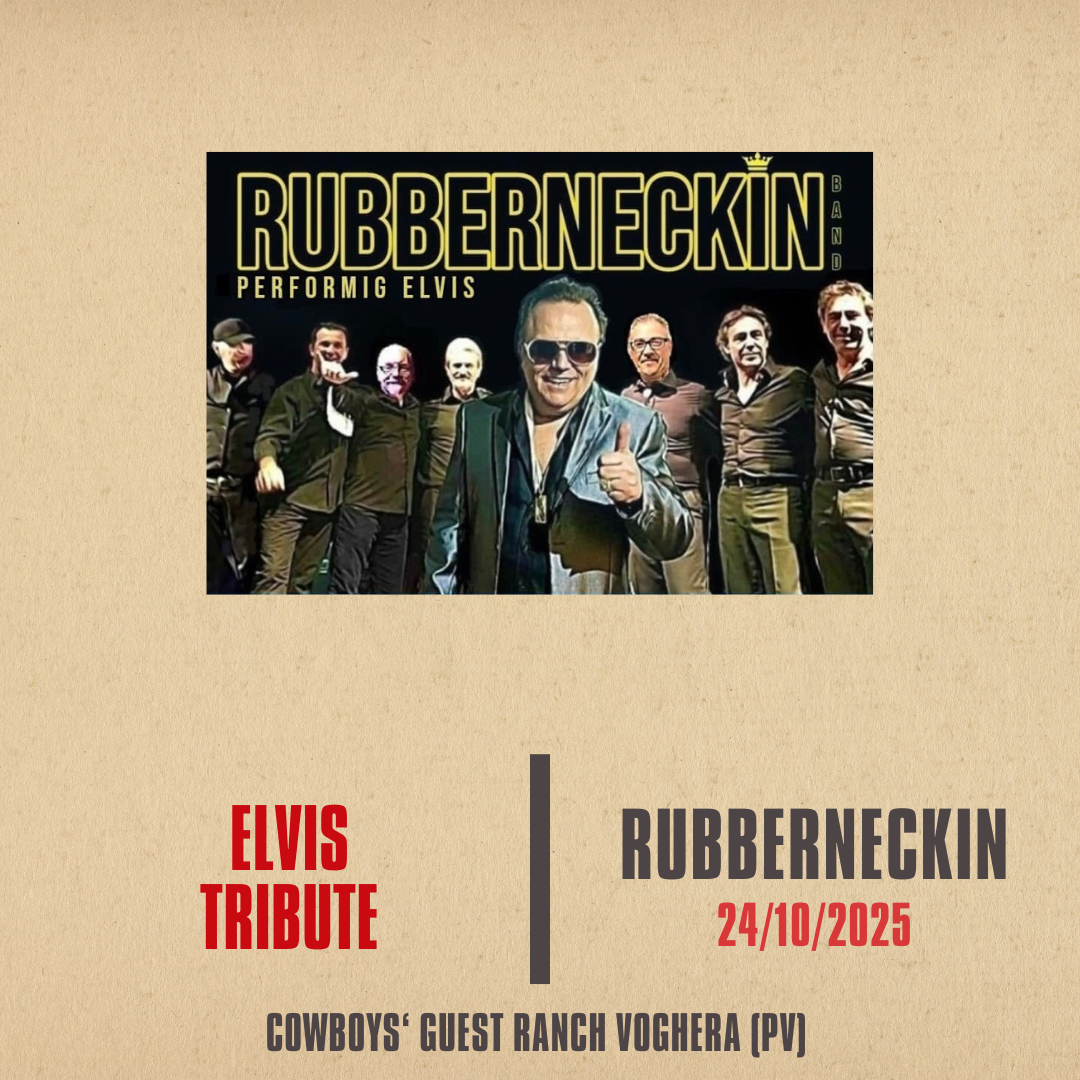 Cowboys' Guest Ranch Via T. Morato 18, Voghera, PV, ItaliaPer la prima volta al Ranch, arriva la Rubbeneckin Band con il suo straordinario tributo a Elvis Presley, il Re del Rock’n’Roll! Un concerto ricco di energia, passione e grandi classici, per una serata che farà ballare e cantare tutti! ✨ Una grande prima, da non perdere, tra musica live, atmosfera vintage e uno show…