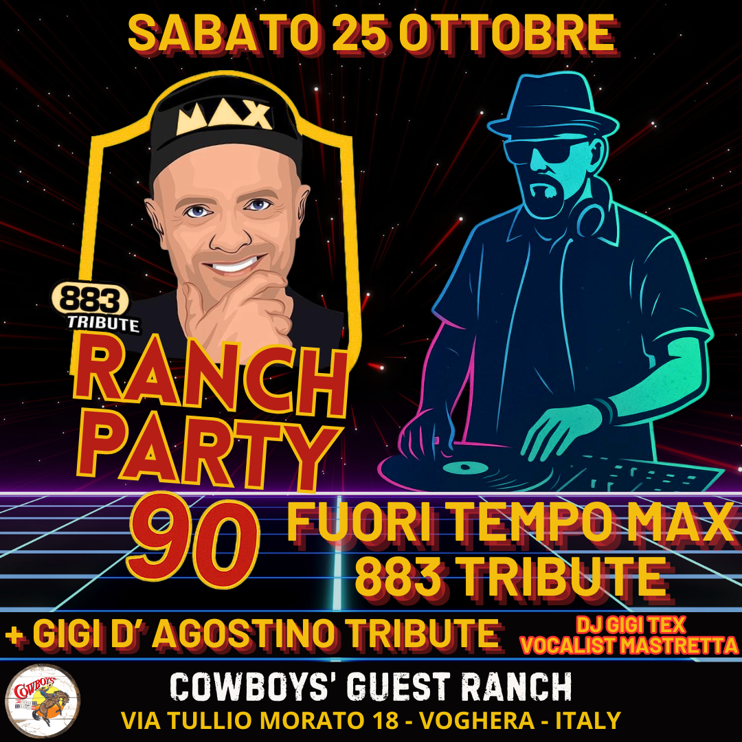 Cowboys' Guest Ranch Via T. Morato 18, Voghera, PV, ItaliaFuori Tempo MAX – 883 Tribute + Gigi D'Agostino Tribute con DJ Tex & vocalist Ivan il Manstre Un vero tuffo negli indimenticabili anni '90! I Fuori Tempo MAX vi faranno cantare a squarciagola con le hit più amate degli 883: Hanno ucciso l’uomo ragno, Sei un mito, Rotta per casa di Dio e molte…